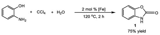 We have developed the highly efficient oxidative cyclocarbonylation of 2-aminophenol to 2-benzoxazolone 1 using FeCl3*6H2O and Fe(acac)3 as catalysts under relatively mild conditions (100–120 °C) in the presence of CCl4 and water. The reaction was studied under various conditions, including the molar ratio of catalyst and reagents: [o-aminophenol]:[CCl4l:[H2O]:[FeCl3*6H2O] = [50–200]:[400–7800]:[0–800]:[1–10], 100–120 °C, 0.25–10 h. A number of solvents were also tested: propanol, ethanol, 1-butanol, benzyl alcohol, ethyl acetate, toluene, and acetonitrile. The yield of 2-benzoxazolone was 75% in acetonitrile using the following conditions: [o-aminophenol]:[CCl4l:[H2O]:[FeCl3*6H2O] = 50:400:800:1, 120 °C, 2 h (Scheme 1). The reaction was carried out in a micro-autoclave (ampoule with stirring). Carrying out the reaction in an open system using microwave irradiation made it possible to reduce the reaction time to 30 min; however, the yield of 2-benzoxazolone did not exceed 40%. The structure of 2-benzoxazolone was established by 1H, 13C NMR spectroscopy, infrared spectroscopy, and GC-MS, as well as a comparison with the literature data [11]: