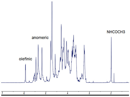 Figure 4 shows the HNMR spectrum of USP enoxaparin. The vinyl peak at 6.2 is new to the spectrum (compared to heparin sodium) and is a marker for the depolymerization extent while the NAc peak at 2.2 acts as a standard for the starting enoxaparin ester [6,7]. The balance of the signals is a good indicator of the average molecular weight. The spectra of the other entries in Table 1 are included in the Supplementary Materials. A smaller peak in the vinyl region is diagnostic for too high a molecular weight, while those at a higher temperature showed substantial formation of extraneous peaks [8].