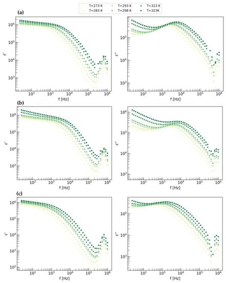 The real dielectric constant () spectra (Figure 1) differs in two characteristic regions in the studied frequency range, separated by a frequency around 2 kHz. At the low frequency range, decreases linearly over five orders of magnitude, with a slope greater than the unity as the frequency increases. The great response of at low frequencies is due to the electrode polarization contribution (EP). This effect represents the formation of the double electric layer (EDL) at the interface of the dielectric material and the electrode, due to the accumulation of ions and free charges [8].