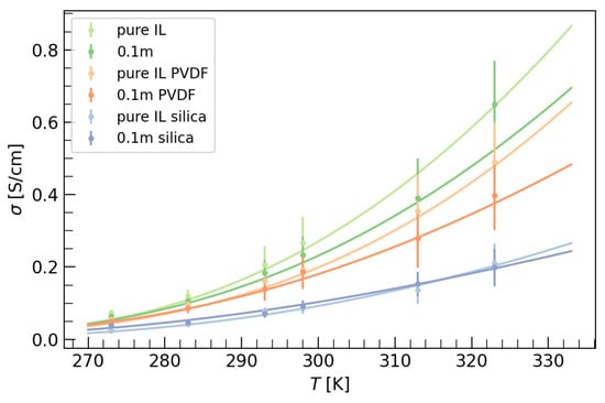 When the temperature is over 40 °C, the ohmic region of pure [BMPyrr][TFSI] is outside of the studied region, so it is not possible to obtain the ionic conductivity by the applied method, making it necessary to enlarge the frequency range to over 1 MHz.