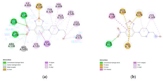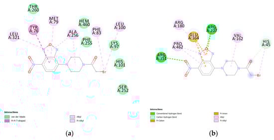 The compound 2-bromo-1-(4-(nitrobenzofurazan-4-yl)piperazin-1-yl)ethanone had the orientation of the -CH2-Br fragment near the C37L/C151T/C442A histidine of the CYP51 triple mutant from Mycobacterium tuberculosis, Microcin-processing metalloprotease TldD/E from E. coli, CYP134A1 with a closed-loop substrate binding from Bacillus subtilis and other bacterial proteins with binding energies from −6.7 to −9.0 kcal/mol (Table 4 and Figure 3).
