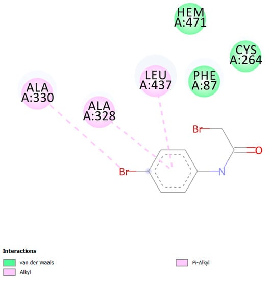 The ligand of 2-bromo-N-(4-bromophenyl)acetamide bound only to the mutant heme domain A264C of cytochrome P450 BM3 from E. coli (PDB code: 3EKB) with localization of the bromine atom of the compound close to cysteine (CYS264) and binding energy of −6.0 kcal/mol (Figure 4).