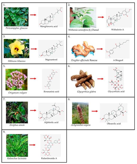 Herbal plants including Pericampylus glaucus, Withania somnifera (l.) Dunal, Zingiber officinale Roscoe, Origanum vulgare, Glycyrrhiza glabra, Ziziphus amole, Achyranthes aspera, and Kalanchoe laciniata have been proven to have anti-asthmatic properties [2,3,4,5,6,7,8]. These herbal plants have valuable phytochemicals which have anti-inflammatory, anti-allergic, and antioxidant properties (Figure 1).