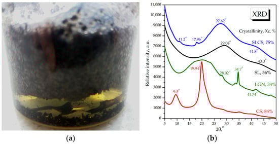 The homogeneous 3% cationic chitosan suspension showed a remarkable property of the physical adsorption of carbon nano/microparticles from the residual ligno-sulfonated sulfite liquor in 99% yield, with the resulting liquid phase after filtration being a clear, pale beige–yellow solution, as can be seen in Figure 1a. Chitosan suspensions of concentrations lower than 3% become ionically supersaturated by the multitude of carbonic and ionic compounds in the sulfite liquor that lost their polymeric interconnections, dispersing homogeneously, without phase separation. The carbonaceous aerogel which resulted after the initial SL sulfite liquor made contact with a homogeneous 3% chitosan suspension in a volumetric ratio of 1:1wasanalyzed using X-ray diffraction (XRD), as shown in Figure 1b, and was compared with the initial SL and SLCS hydrogel, together with initial chitosan and lignin as the standard commercial materials.