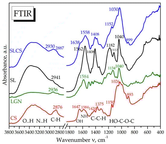 Infrared spectroscopy has proved to be relevant for highlighting absorption bands specific to ligno-sulphonic materials subjected to various physico-thermo-chemical experiments, and is therefore used for spectral comparison with the new chitosan–sulfite liquor aerogel in Figure 3. Chitosan (CS) shows IR absorption bands characteristic of O-H and N-H hydrogen bond vibrations in the wavenumber region of 3500–3000 cm−1, C-H in the region of 3000–2800 cm−1, -OH and -NH in the molecular fingerprint range of 1650–1550 cm−1, amine and amide bands in the region of 1450–1250 cm−1, and bands characteristic of C-O and C-O-C bonds in polysaccharides in the region of 1200–850 cm−1, respectively.