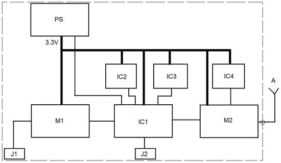 Schematic representation of the experimental model: M1: EmStat pico module with ADuCM355 microcontroller; M2: Multi-Band NB-IoT module; IC1: Low-Power, 32-bit Cortex-M0+ microcontroller; IC2: 3-Axis digital accelerometer; IC3: 32Mbit serial flash memory; IC4: Embedded subscriber identity module; PS: power supply; J1: USB connector; J2: DS1020-03ST1D connector; A: antenna.