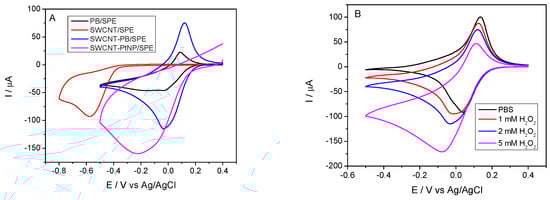 Figure 3B shows the electrocatalytic behavior of SWCNT-PB based sensors towards the reduction of different concentrations of H2O2. An increasing of the cathodic peak current intensity was observed with the increase in the H2O2 concentration, from 91 µA in the presence of 1 mM H2O2 to 168 µA for 5 mM, with a simultaneous decrease in the anodic peak currents and a shift of the cathodic peak potentials towards more negative values, from −0.007 V to −0.076 V.