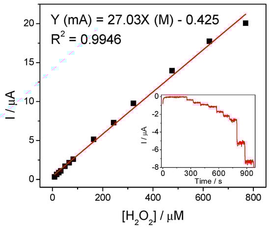 Calibration of the SWCNT-PB/SPE sensor for the reduction of H2O2 (E = +0.05 mV, PBS pH 7). Inset: the current intensity vs. concentration of hydrogen peroxide.
