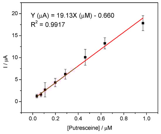 The developed biosensor demonstrated improved analytical performances for the detection of putrescine, such as a specific sensitivity of 153.7 mA∙M−1∙cm−2, a detection limit of 4.7 µM and a quantification limit of 15.5 µM, with a linear range extended from 0.02 and 1 mM. The value of the detection limit achieved for putrescine is lower compared to those reported for a DAO-based biosensors modified with PB and indium tin oxide nanoparticles (7.8 μM) [] or with an MAO-based biosensor modified with tetrathiafulvalene and gold-nanoparticles (9.9 μM) [].