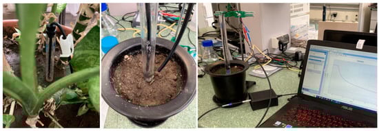 The DAO-SG-SWCNT-PB/SPE biosensors were used for the detection of putrescine content in soil samples used for the cultivation of ornamental plants in the laboratory. The soil solutions to be analyzed were extracted with lysimeters (Figure 6). The DAO-based biosensors were integrated with the developed miniaturized portable system, which allows for the collection and transmission of the data through a wireless connection, from several sampling points in the field.