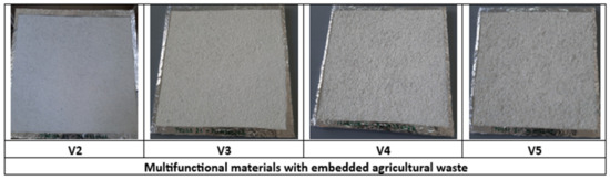 The paper presents the results from the monitoring of VOC emissions of four types (V2, V3, V4, and V5), of multifunctional materials (finishes/protections) with embedded animal waste and agro-industrial by-products in the closed mode of the experimental stand (emissions test chamber). It should be noted that each of the above-mentioned materials is a distinct composite material, with its own recipe and content of waste and by-products. The multifunctional materials consisted of three layers: a primer followed by two additional layers. Each of these layers contained a mixture of animal waste and agro-industrial by-products. Also, each material contains two main elements: one is the continuous component, with the role of a binder, which consists of one film-forming finishing product based on acrylic resin, denoted as AB1 (acrylic binder, in aqueous dispersion) and, respectively, AB2 (acrylic binder, in aqueous dispersion, containing fungicidal substances that prevent the spread of mold in the paint layer); the second is the discontinuous component, consisting of either a mixture of three fractions of sunflower seed husk (SSH) by-products, with a maximum size of 4, 6, and 8 mm, or a mixture consisting of by-products of 6 mm, 8 mm, and 10 mm fractions, together with waste from sheep’s wool. Along with the two primary components mentioned earlier, some multifunctional materials in this study also contained a liquid adhesive based on polymer resin as an additive. The test samples were prepared as follows: each of the four tested materials have been applied on a plasterboard support (resulting different products thickness values), only on faces, not on the sides of the support plates and the edges of the plates were covered with an aluminum foil. The sample of material was placed in the emission testing chamber after six hours from the application of the last layer. Aspects of the samples of multifunctional materials selected for specific measurements regarding the VOCs emissions are shown in Figure 1.