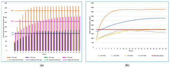 Figure 3b shows the comparative analysis of the obtained results, in µg/m3, with the value of 2000 µg/m3 being, according to ww.eurofins.com, the limit of class B, one of the pollutant emission classes for construction products. From this point of view, it can be concluded that materials V3 and V4, monitored in the first 24 h from the application, are put into class B, with emission values of 1500 and 2000 µg m−3.