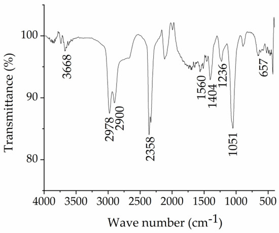 Sodium lignosulphonate was separated from the CCH stream using an ultrafiltration method, and its structure was confirmed by FT-IR spectroscopy. Figure 1 shows the functional groups of the separated lignosulphonate. The bands are attributed as follows: 3668 cm−1 (-OH stretching vibrations), 2978 cm−1 and 2900 cm−1 (-CH symmetric stretching vibrations), 1560 cm−1 and 1404 cm−1 (stretching vibrations of aromatic groups), 1236 cm−1 (-OCH3 group vibration), 1051 cm−1 (S=O symmetric stretching of the -SO3 groups) and 600–700 cm−1 (S-O group vibration). Data agree with those reported in the literature [11], confirming that sulphonate groups were added to lignin.