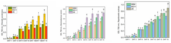 For D. communis, the OD values varied across the three media during the experiment. On day 1, the OD values were relatively low and comparable in all media, with slightly higher values observed in Z8 medium. However, as the cultivation progressed, the OD increased significantly in all media, with the highest growth observed in Z8 medium at day 15. Notably, BG-11 and BBM media also supported considerable growth of Desmodesmus communis, but Z8 demonstrated superior performance in promoting cellular development [33].