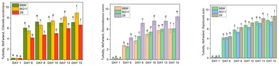 Turbidity values for Ch. sorokiniana increased consistently over the cultivation period in all three media. Interestingly, BG-11 medium demonstrated the highest turbidity values for Ch. sorokiniana at later time points, surpassing the values observed in Z8 medium. BBM also supported the growth, with relatively lower turbidity values than BG-11 and Z8.
