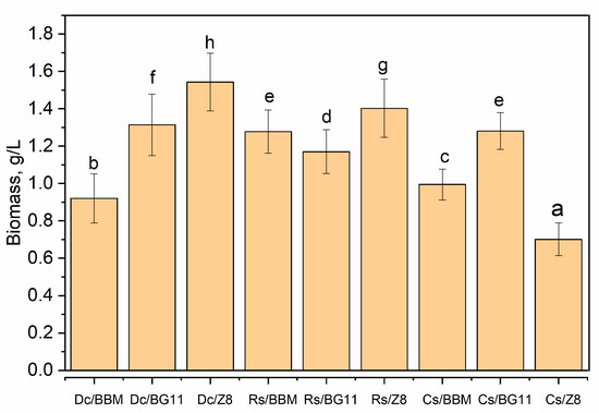 To confirm the selection of the most suitable cultivation media, biomass accumulation (Figure 4) was assessed for each microalgae strain after 15 cultivation days [16].