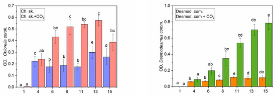 Optical density for microalgae growth with and without CO2 supplementation. (Left) Chlorella sorokiniana. (Right) Desmodesmus communis. The bars height are mean values ± statistical error bars. For the values with the same letter the difference between the means is not statistically significant at p<0.05.