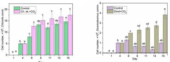 Cell number for microalgae growth using CO2. (Left) Chlorella sorokiniana (Ch. sk.). (Right) Desmodesmus communis (Dmd). The bars height are mean values ± statistical error bars. For the values with the same letter the difference between the means is not statistically significant at p<0.05.