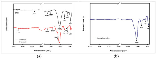 ATR-FT-IR spectra for: (a) diatomaceous earth (diatomite) and bentonite, and (b) amorphous silica resulting from extracted reed biomass.
