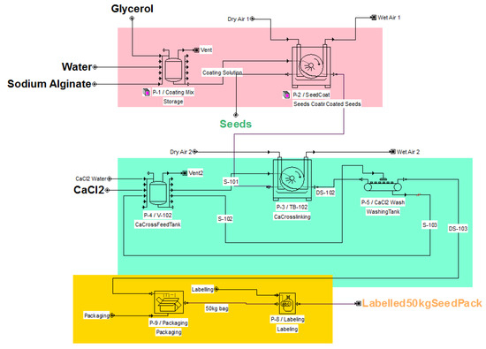 In the first section, the coating solution was first obtained by mixing in water, sodium alginate, and glycerol, such that the final solution was a 2% solution of both sodium alginate and glycerol in water. In terms of the order, water was added first, followed by glycerol, and alginate. The quantities per batch vary as they are related to the coating quantity requested by the coating unit in which the resulting solution becomes a feed. The mixing tank is priced at EUR 10,000 and has a fixed volume of 100 L. After three charge operations starting with the water stream, followed by glycerol and sodium alginate, the added ingredients were mixed for 2 h. The transfer into the coating unit was synchronized with the coating process. The coating process was performed with 50 kg/batch of seeds formed from a declared unit of 1 kg of seeds. This quantity was charged into the coating unit right before the coating process, which happens at 40 °C, taking 2 h or more depending on the desired amount of coating. The coating unit has an estimated price of EUR 30,000 and a volume of 100 L. After the coating process was finished, the coated seeds were taken to the next section.