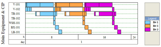 Scheduling of the equipment use in a sequence of three batches using SuperPro Designer 10.