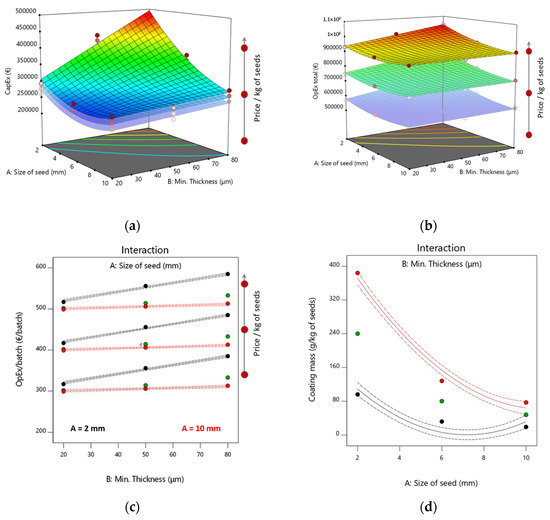 (a) The response variables as a function of the input variables: capital costs/CapEx; (b) operation costs; (c) operation costs per package of 50 kg of coated seeds at required thicknesses; (d) coating mass per kg of initial seeds.