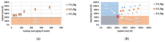 The simulated data presented above, namely the response variables can also be cross-correlated to give more information on the economic aspect of the process. In Figure 4a, the cross-correlation of the coating mass and the capital costs is represented. It shows that up to a coating mass of 100 g/kg of seed the capital costs are relatively uniform and are up to EUR 300,000, after which the capital costs increase more significantly. This is an effect of the multiple units required to achieve the desired production; in some sense, it increases stepwise as the simulation suggests, with the increase in the number of units for any given operation. Since the units hold operations that change differently with respect to the coating mass, the overall effect of the discrete increase becomes more and more even. At some point, although not be discussed in this work, the estimated capacity of each unit has to be increased to increase the processing efficiency. Figure 4b represents the cross-correlation between the operating costs and the capital costs for all simulations. This shows that the operating costs increase somewhat linearly to the capital costs for all seed sizes and required coating thickness. Of course, the input seed cost has a higher impact on the operating costs since it is the main raw material. Capital costs are not as influenced. However, overall, Figure 4b shows that the proposed process has a high OpEx with low CapEx. It also shows that the proposed process has high versatility with respect to the seed coating since the same investment can be used for different type of seeds.