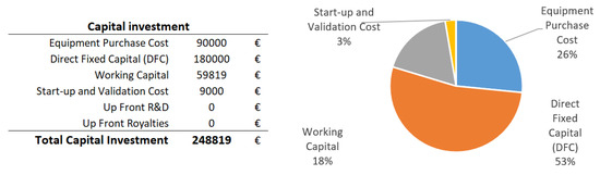 Figure 5 shows that the equipment purchases represent 26% of the capital expenditures, the direct fixed capital represents 53% and the working capital 18%. Start-up and validation costs represent the remaining 3%. The equipment purchase cost is estimated from the user-defined values of the main units. The start-up and validations costs are estimated as 5% from the direct fixed capital, which was approximated as double the equipment cost. The working capital is calculated by Super-Pro-Designer 10 and reflects the estimated costs to cover 30 days of labor, raw materials, and utilities.