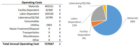 Figure 6 splits the operating costs in its main components and shows that the materials represent 68%, facility-dependent costs are 6%, while labor represents 23%. Laboratory/QC/QA are estimated as 15% from the labor-dependent costs. Utilities are calculated at the standard consumption rates as estimated by the software.
