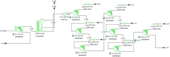 A process sheet was built into SuperPro Designer 10 (Figure 1) that takes the initial feed into a microfiltration batch unit, which separates the hemicellulose (precipitated partially by ethanol, for example) from the sodium lignosulfonate and the salts. This was shown to have a significant impact on the purity of the product in the product stream. The permeate of this stage is fed into a multi-effect evaporator, as this is the most efficient, in comparison with other drying/evaporating processes (Figure A1, Table A1 and Table A2). The concentrate is then fed into a series of filtration units at 3-bar absolute pressure. The final concentrate is considered the product stream, rich in sodium lignosulfonate.