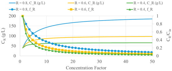Figure 2 shows the interdependency between the concentration factor, the mass fraction in the retentate, the concentration in the retentate of the key component, and the maximum achievable concentration in the retentate for the case of concentrating a feed stream in a feed-and-bleed filtration unit operated in continuous mode.