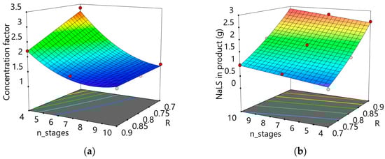 The effect of the number of stages and the rejection coefficients of the key component on the useful concentration factor (a) and the mass of the recovered product in the permeate (b) (starting from an initial flow mass of 4 kg/h in a total stream mass flow of 100 kg/h). The regions close to the optimal points are shown in blue color, the darker being the optimal area. The region far from optimal points are in other colors of the spectrum.