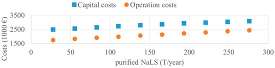 Figure 4 shows how the capital and operating costs scale with an increase in the production capacity. While the production capacity increases 10-fold, both the capital and the operating costs only increase less than 2-fold. This shows that, for a large production capacity, the selling price of the purified sodium lignosulfonate can be greatly reduced, which could lead to a competitive price for various applications.