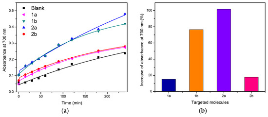 (a) Dependence of the reducing power as a function of time for the target compounds; (b) increase in absorbance at 700 nm for the targeted molecules after 240 min.