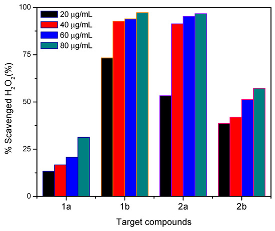 Percentage of H2O2 scavenged for the target compounds 1a–b and 2a–b at different concentrations (20–80 µg/mL).