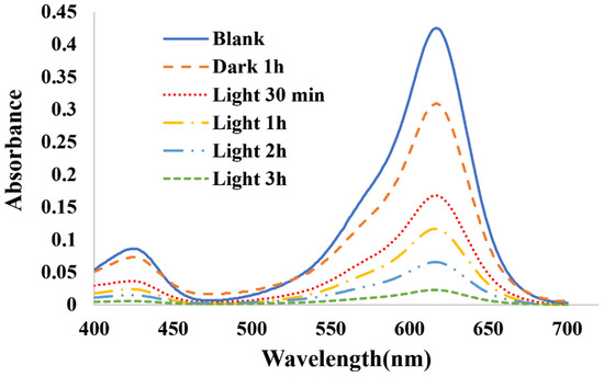 To confirm the photocatalytic properties, precisely 0.025 g of bismuth ferrite, synthesized at a specific 3:6 ratio, was meticulously introduced into the reaction vessel alongside malachite green. The UV–Vis spectrum of malachite green, with an initial concentration of 10 ppm, was closely monitored at different time intervals, as depicted in Figure 4.