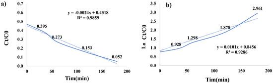 The degradation percentage was calculated with reference to the initial concentration (C0), which was determined after one hour of dark exposure. A comprehensive kinetic analysis was conducted to identify the most suitable kinetic model governing the photocatalytic decomposition of malachite green over 180 min, as visually represented in Figure 5. The pseudo-first-order kinetics model can be mathematically expressed as follows (Equation (2)) [33]: