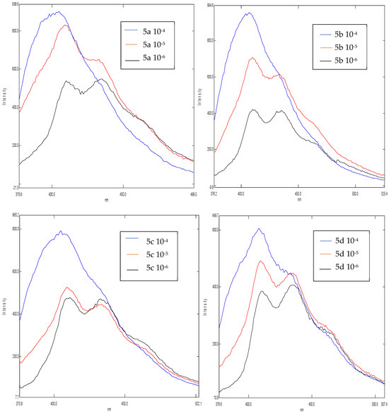 With the aim of evaluating the interest of our synthesized products 5a–d, we decided to study their molecular fluorescence in three different concentrations, namely 10−4, 10−5 and 10−6, using DCM as a solvent. The fluorescence emission spectra obtained show the influence of the concentration on the intensity (Figure 2).