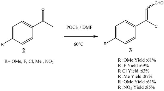 The Vilsmeier–Haack reagent is an iminium salt prepared by reacting phosphorusoxychloride (POCl3) and DMF at 0 °C. The chloromethylene iminium salt interacts with the enolic form of acetophenone to form an iminium salt, which is rapidly hydrolyzed to isolate β-chloroacroleins (Scheme 2).