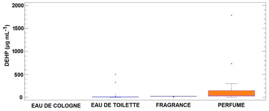 The concentration levels for each PAE in the 57 positive samples from the four categories are summarized in Table 4. As shown, DEHP is not only the PAE with the highest frequency of appearance but also the one found in the highest concentration, an order of magnitude higher than any other detected PAE. When considering different types of products, it is also observed (see Figure 1) that DEHP concentrations are higher in categories with a higher percentage of aromatic essence. Consequently, higher concentrations were measured in perfumes, followed by fragrances and eau de cologne. A similar concentration pattern was observed for DBP. The other two detected phthalates (DMEP and DMP) were not commented upon due to the small number of samples in which these PAEs appeared. The results obtained presented comparable levels to those reported by Koniecki et al. [7] in fragrance samples and by Al-Saleh and Elkhatib [8] in branded perfumes. However, in the latter case, the frequency of appearance was reported as BBP > DMP > DEP > DEHP > DBP (using a different threshold limit of 0.1 µg mL−1 for BBP, DMP, and DBP).