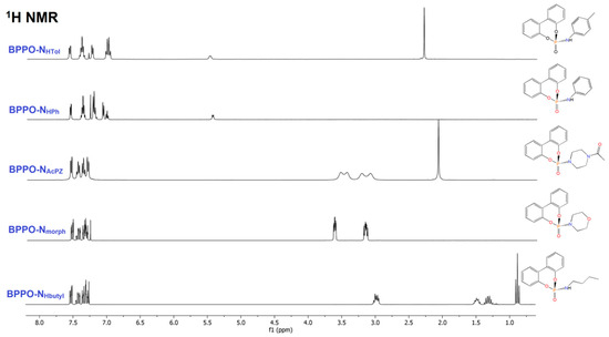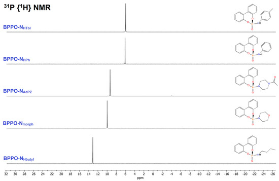 The 1H NMR spectra of all the compounds showed the disappearance of the P-H resonance of BPPO, while the four multiplets due to the equivalent aromatic rings of the biphenyl moiety were maintained. Besides the aromatic resonances, the 1H NMR spectrum of BPPO-NHButyl in CDCl3 shows the superposition of multiplets between 3.05 and 2.90 ppm assigned to the N-bonded hydrogen atom and the CH2 fragment. The other aliphatic resonances fall at 1.48, 1.31, and 0.88 ppm. The 13C{1H} NMR signals of the butyl chain fall in the 42–13 ppm range, and the one at 34.03 ppm exhibits a coupling constant of 5.5 Hz with the 31P nucleus, in agreement with the formation of the P-N bond. The presence of P-bonded morpholine in BPPO-Nmorph was highlighted by two multiplets at 3.62 and 3.16 ppm, correlated to resonances in the 13C{1H} NMR spectrum at 66.98 and 45.47 ppm. The 13C{1H} NMR signals are doublets thanks to the coupling with 31P. In the 1H NMR spectrum of the comparable BPPO-NAcPz compound, the four CH2 fragments of the piperazine heterocycle are all non-equivalent because of the different substituents at the nitrogen atoms and because of the lack of free rotation of the acetyl group around the N-C bond, that removes the equivalence of the two halves of the piperazine ring. The CH2 1H NMR chemical shift values are 3.53, 3.44, 3.22, and 3.09 ppm, correlated to 13C{1H} NMR resonances in the 47–41 ppm range. The acetyl substituent resonates at 2.08 ppm in the 1H NMR spectrum and at 169.17 and 21.30 ppm in the 13C {1H} NMR spectrum. The NMR spectra of BPPO-NHPh and BPPO-NHTol are similar, with obvious differences related to the presence in the second case of the methyl substituent. The NH resonance is clearly observable in the 1H NMR spectrum at about 5.45 ppm, with JPH coupling constant close to 8 Hz. The 1H NMR spectra are shown in Figure 1. A single sharp resonance was observed in all the 31P{1H} NMR spectra between 13.5 and 9.5 ppm for the derivatives of aliphatic amines and around 6.2 ppm for BPPO-NHPh and BPPO-NHTol (Figure 2).