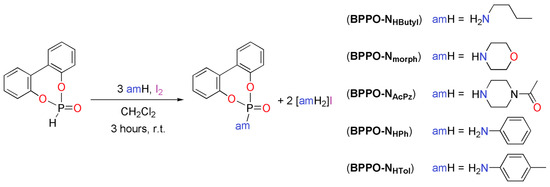 According to the recently published patent [49], the conversion of BPPO is related phosphoramidates can be carried out in a single step by reacting the precursor with I2 in the presence of a suitable aliphatic or aromatic amine (amH), as depicted in Scheme 1. The compounds BPPO-NHButyl, BPPO-Nmorph, BPPO-NAcPz, BPPO-NHPh, and BPPO-NHTol were isolated with yields comprised between 12% and 94% and had a high degree of purity. The low yields obtained in some cases are mainly attributable to work-up issues. With the exception of butylammonium iodide, the by-product [amH2]I was always recovered by filtration from the reaction mixture. It is worth noting that an alternative synthetic approach for the preparation of BPPO-Nmorph is already present in the literature [50].