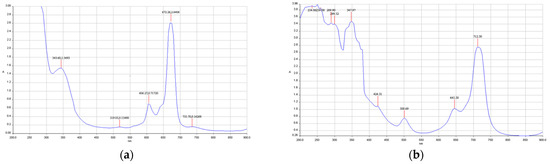 All phthalocyanines showed the typical UV-Vis bands in DMF and DMSO. The Q band appeared at about 650–670 nm, and the Soret band appeared at 300–350 nm. Both bands are π-π* transitions in nature. The positions of the bands depend on the central metal (Figure 1). For zinc phthalocyanine (ZnPc), Q and Soret bands appeared at 672 nm and 343 nm, respectively (see Figure 1a). However, manganese phthalocyanine (MnPc) showed different Q and Soret bands at 712 nm and 347 nm (see Figure 1b). These results can be ascribed by the fact that Mn, as well as other metals with empty d-orbitals, are more prone to suffer charge-transfer bands [2,6].