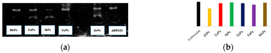 All phthalocyanines showed photoactivity against pBR322 plasmid in gel agarose electrophoresis, except for MnPc (Figure 2a). These results can be described on the basis of free radical photogeneration, which are able to produce DNA damage. These first results showed that phthalocyanines may harm pBR322 plasmid due to its transformation of the supercoiled form into linear and open circular forms [6,8]. On the other hand, ZnPc showed the highest phototoxic activity against human erythrocytes (Figure 2b). These damages have contributions from both phototoxic mechanisms (singlet oxygen and other free radicals). However, it is expected that the level of damage also depends on how the phthalocyanine molecules interact with the human erythrocyte membrane [6,15].