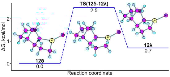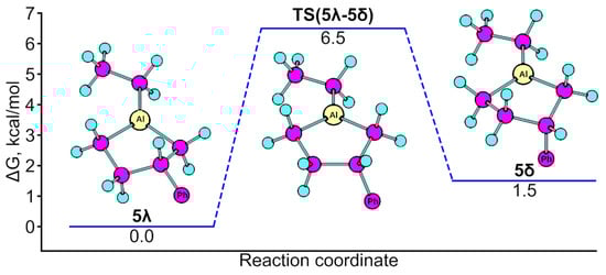 As follows from Figure 5, conformations of alumolane exo-annelated with nonbornene were found on the potential energy surface of the molecule that differ in energy by 0.7 kcal/mol. Conformational dynamics are associated with the vibration (∆G≠ = 2.5 kcal/mol) of the methylene fragment (Al-CH2-) of the five-membered ring. The inversion of metal-lacycle in a spiro-linked compound requires significantly more energy; for example, the energy barrier for the conformational transition in alumolane 15 is 7.4 kcal/mol.