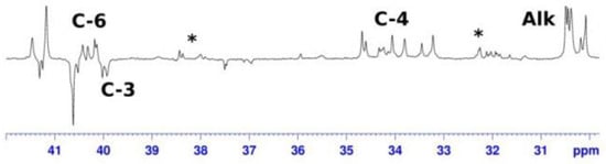 13C NMR spectra (dept 135 of 1-ethyl-3-butylalumolane 4 in toluene (50% OAC): at T = 298 K (symbol * denotes minor carbalumination products).
