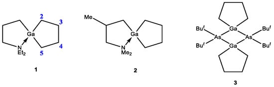 - Schumann, H.; Just, O.; Seuß, T.D.; Görlitz, F.H.; Weimann, R. Intramolekular stabilisierte galla- und Indacyclohexane, -cyclopentane und -cyclopentene; Röntgenstrukturanalyse von (CH2)5Ga(CH2)3NM. J. Organomet. Chem. 1994, 466, 5–14. [Google Scholar] [CrossRef]