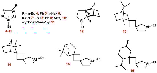 We found that the theoretical and experimental data are consistent, so we also performed a conformational analysis for 3-spiro-substituted polycyclic alumolanes and nonbornen annelated alumolanes 12–16 []. The results are presented in Figure 5.