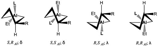 Optimized structures of the two most energetically favorable dimers of 1,3-diethylalumolane: anti-SR-δλ (∆G = −34.3 kJ/mol) and SAlRAlSS-δδ (∆G = −30.1 kJ/mol).