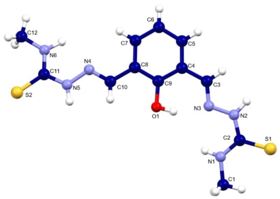 The recrystallization in methanol of solid H3LMe allowed us to obtain yellow crystals suitable for X-ray diffraction studies. The asymmetric unit of the H3LMe ligand consists of a ligand molecule solvated by a methanol molecule (Figure 3). The main bond distances and angles given in Table 1 and Table 2 are in the expected range for bisthiosemicarbazone ligands [7].